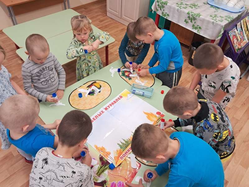 Дети узнали, что эта памятная дата была предложена народным поэтом Дагестана Расулом Гамзатовым и отмечается ежегодно 22 октября. В 1965 году он создал стихотворение «Журавли». Эти красивые птицы стали символом памяти, скорби и света. В этот день чтят память погибших в войнах солдат и прославляют дружбу народов. На занятии поговорили о значении праздника, посмотрели фотографии и иллюстрации, а затем приступили к творческой части занятия. Ребята сделали коллективную аппликацию: "День белых журавлей". Эти белые птицы стали воплощением наших добрых пожеланий мира и согласия на земле.