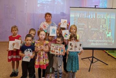 В музыкальном зале дети с интересом путешествовали по стране музыкальных инструментов, рассматривали и знакомились с музыкальными инструментами, отгадывали загадки, а потом с большим удовольствием играли в игры.