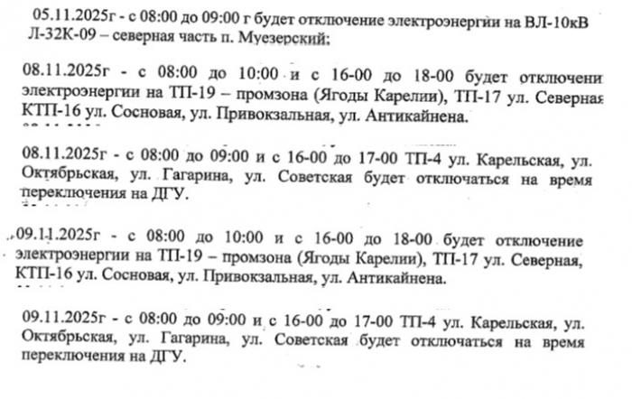В связи с выполнением капитального ремонта на электрических сетях в пгт.Муезерский (замена опор и линий электропередач), АО «ПСК» сообщает об отключении электроэнергии: